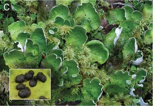 The thallus is not always the part of the lichen that is most visually noticeable. Some lichens can grow inside solid rock between the grains (endolithic lichens), with only the sexual fruiting part visible growing outside the rock.[36] These may be dramatic in color or appearance.[36] Forms of these sexual parts are not in the above growth form categories.[36] The most visually noticeable reproductive parts are often circular, raised, plate-like or disc-like outgrowths, with crinkly edges, and are described in sections below.