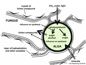Phycobionts can have a net output of sugars with only water vapor.[45] The thallus must be saturated with liquid water for cyanobionts to photosynthesize.[45]