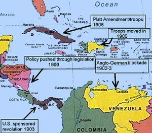 ادعى روزڤلت أنه رفض الإمبريالية، لكنه اعتنق شبه المتطابقة عقيدة التوسع.[بحاجة لمصدر] عندما كتب روديارد كپلنگ القصيدة الإمبريالية "عبء الرجل الأبيض" لروزڤلت، أخبر السياسي زملائه أنه "شعر رديء إلى حد ما، ولكنه شعور جيد من وجهة نظر التوسع."[33]وقد أعلن روزڤلت أن نتيجة طبيعية لعقيدة مونرو كمبرر،[34]على الرغم من أن طموحاته امتدت إلى أبعد من ذلك، إلى الشرق الأقصى. لاحظ العلماء التشابه بين سياسات الولايات المتحدة في الفلپين والأفعال الأوروبية في المستعمرات في آسيا و إفريقيا خلال هذه الفترة.[35]
