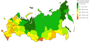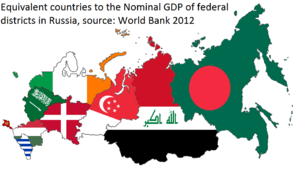 الاقتصاد الروسي هو سادس أكبر اقتصاد في العالم حسب القدرة الشرائية المتعادلة.[24] بين 2000 و2012، كانت صادرات الطاقة الروسية هي الممول الرئيسي لنمو سريع في معايير الحياة، مع ارتفاع الدخل المتاح الحقيقي إلى 160%.[25] من حيث المقومة بالدولار تقدر هذه الزيادة بأكثر من سبعة أضعاف الدخل المتاح منذ عام 2000.[26] ومع ذلك، فقد توزعت هذه المكاسب بشكل غير متساو على 110 من الأغنياء يملكون 35٪ من جميع الأصول المالبية التي تملكها العائلات الروسية.[27] منذ عام 2008 سميت موسكو "بعاصمة مليونيرات العالم" حسب مجلة فوربس.[28][29]