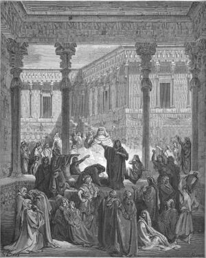 During the first millennium BC, the Babylonians worshipped a deity under the title "Bel", meaning "lord", who was a syncretization of Marduk, Enlil, and the dying god Dumuzid.[28][29] Bel held all the cultic titles of Enlil[29] and his status in the Babylonian religion was largely the same.[29] Eventually, Bel came to be seen as the god of order and destiny.[29] The cult of Bel is a major component of the Jewish story of "Bel and the Dragon" from the apocryphal additions to Daniel.[30] In the account, the Babylonians offer "twelve bushels of fine flour, twenty sheep, and fifty gallons of wine" every day to an idol of Bel and the food miraculously disappears overnight.[30] The Persian king Cyrus the Great tells the Jewish wise man Daniel that the idol is clearly alive, because it eats the food that is offered to it,[30] but Daniel objects that it "is only clay on the inside, and bronze on the outside, and has never tasted a thing."[30] Daniel proves this by secretly covering the floor of the temple with ash.[30] Daniel and Cyrus leave the temple and, when they return, Daniel shows the king the human footprints that have been left on the floor, proving that the food is really being eaten by the seventy priests of Bel.[30] Bel is also mentioned in the writings of several Greek historians.[29]