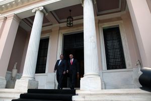 Former Prime Minister, Kostas Karamanlis and George Papandreou in the ceremony for the official handover at the Maximos Mansion.