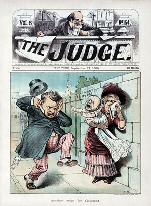Commentator Jeff Jacoby notes that, "Not since George Washington had a candidate for president been so renowned for his rectitude."[11] In July the Republicans found a refutation buried in Cleveland's past. Aided by sermons from a minister named George H. Ball, they charged that Cleveland had fathered an illegitimate child while he was a lawyer in Buffalo. When confronted with the scandal, Cleveland immediately instructed his supporters to "Above all, tell the truth." Cleveland admitted to paying child support in 1874 to Maria Crofts Halpin, the woman who claimed he fathered her child, named Oscar Folsom Cleveland after Cleveland's friend and law partner, but asserted that the child's paternity was uncertain.[12] Shortly before election day, the Republican media published an affidavit from Halpin in which she stated that until she met Cleveland her "life was pure and spotless," and "there is not, and never was, a doubt as to the paternity of our child, and the attempt of Grover Cleveland, or his friends, to couple the name of Oscar Folsom, or any one else, with that boy, for that purpose is simply infamous and false."[13] In a supplemental affidavit, Halpin also implied Cleveland had raped her, hence the conception of their child.[13][14] Republican cartoonists across the land had a field day.[15][16][17][18][19][20]
