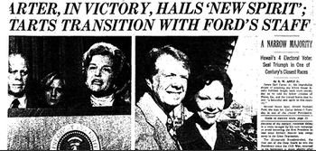 جيمي كارتر مرشح الحزب الديمقراطي يفوز بالانتخابات الأمريكية على جرالد فورد الذي تولي الرئاسة عقب استقالة نيكسون ب297 مندوب في المجمع الانتخابي وهي التي تصفها الجريدة بالأغلبية الضئيلة. ويتضح من الخريطة توزيع الولايات على المرشحين. كارتر بالأسود وفورد بالأبيض. فالجنوب الذي يصوت تقليديا للجمهوريين الآن صوت بشكل كبير للديمقراطي كارتر كونه في الأصل مزارع من ولاية جورجيا. وكاليفورنيا التي اصبحت حصنا للديمقراطيين الآن صوتت للمرشح الجمهوري. على جانب آخر اعترف فورد فورا بالهزيمة وعرض التعاون مع الرئيس المنتخب في تسهيل انتقال السلطة .