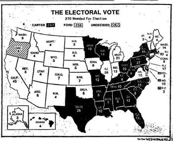 قالب:1976 United States presidential election imagemap Presidential election results map. Blue denotes states won by Carter/Mondale and red denotes those won by Ford/Dole. Pink is the electoral vote for Ronald Reagan by a Washington faithless elector. Numbers indicate the number of electoral votes cast by each state and the District of Columbia. | |||||||||||||||||||||||||||||