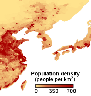 The coasts of the Yellow Sea are very densely populated, at approximately 250 inhabitants per square kilometer (650/sq mi).[36] The sea waters had been used for fishing by the Chinese, Korean and Japanese ships for centuries. The bottom layers are especially rich in fish with about 200 fish species exploited commercially, especially sea bream, croakers, lizard fishes, prawns, cutlassfish, horse mackerel, squid, eel, filefish, Pacific herring, chub mackerel, flounder[37] and jellyfish.[38] The intensity of fishing has been gradually increasing for China and Korea and decreasing for Japan. For example, the production volumes for China rose from 619,000 tonnes in 1985 to 1,984,400 tonnes in 1996.[39] All species are overfished, however, and while the total catchments are rising, the fish population is continuously declining for most species.[4][40]