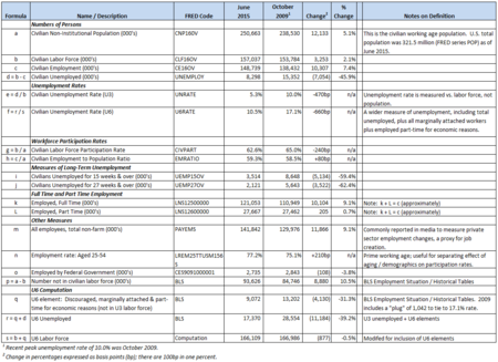 هناك مجموعة متنوعة من التدابير المستخدمة لتتبع حالة سوق العمل في الولايات المتحدة. كل يوفر نظرة ثاقبة العوامل التي تؤثر على العمالة. يوفر مكتب إحصاءات العمل "دفترًا" يعرض المتغيرات الرئيسية المرتبطة بالعمالة في الاقتصاد.[30][31] Members of the Federal Reserve also give speeches and Congressional testimony that explain their views of the economy, including the labor market.[32] اعتبارًا من سبتمبر 2017 ، كان انتعاش التوظيف بالنسبة لمستوى نوفمبر 2007 (قبل الركود) قد اكتمل بشكل عام. تحسنت متغيرات مثل معدلات البطالة (U-3 و U-6) وعدد العاملين إلى ما بعد مستويات ما قبل الركود. ومع ذلك ، كانت مقاييس المشاركة في القوى العاملة (حتى بين الفئة العمرية العاملة الرئيسية) ، وحصة العاطلين عن العمل لفترة طويلة أسوأ من مستويات ما قبل الأزمة. علاوة على ذلك ، تحول مزيج الوظائف ، مع حصة أكبر من العاملين بدوام جزئي عن حصة ما قبل الأزمة. فمثلا:
