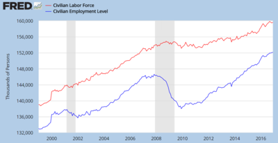 Number of persons in U.S. labor force and number employed. The gap is the number unemployed, which peaked at 15.4 million in October 2009 and fell to 7.4 million by November 2016.[22]