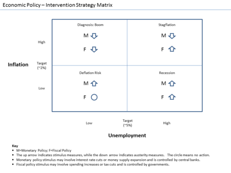 العمالة هي السبب والرد على معدل النمو الاقتصادي ، والذي يمكن أن يتأثر بكل من الحكومة السياسة المالية (قرارات الإنفاق والضرائب) و السياسة النقدية (إجراء مجلس الاحتياط الفيدرالي).