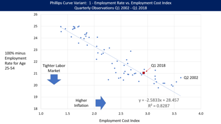 • قدّر مكتب ميزانية الكونغرس أن الولايات المتحدة كانت حوالي 2.5 مليون عامل أقل من العمالة الكاملة في نهاية عام 2015 و 1.6 مليون في 31 ديسمبر 2016 ، ويرجع ذلك بشكل رئيسي إلى انخفاض المشاركة في القوى العاملة.[17]