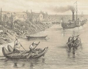 A modern Chilean steamboat and primitive rafts in Huasco in the 1850s illustrates the uneven modernization of the Chilean economy.