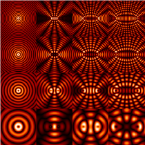 Interference of two circular waves - Wavelength (decreasing bottom to top) and Wave centers distance (increasing to the right). Absolute value snapshots of the (real-valued, scalar) wave field. As time progresses, the wave fronts would move outwards from the two centers, but the dark regions (destructive interference) stay fixed.