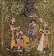 It seems clear that miniature painting, often illustrating manuscripts, has a very long history,[5] but Jain miniatures from about the 12th century, mostly from West India, and slightly earlier Buddhist ones from the Pala Empire in the east are the oldest to survive.[6] Similar Hindu illustrations survive from about the 15th century in the west, and 16th century in East India,[7] by which time the Mughal miniature under Akbar was also sometimes illustrating translations into Persian of the Hindu epics and other subjects.[8]