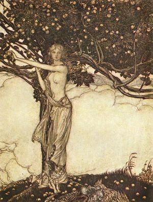 In Norse mythology, the golden apples are the source of the gods' immortality and perpetual youth; comparable to the role of ambrosia in Greek mythology. They are cultivated by—and most often associated with—the goddess Iðunn.