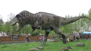 Full size model in Poland, depicting Tyrannosaurus with both feathers and scales
