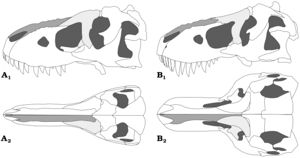 Diagram showing the differences between a generalised Tarbosaurus (A) and Tyrannosaurus (B) skull