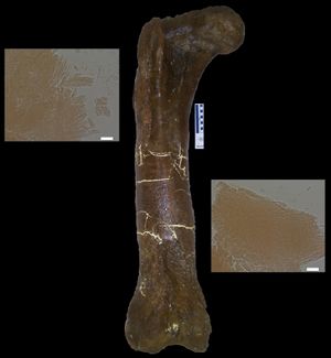T. rex femur (MOR 1125) from which demineralized matrix and peptides (insets) were obtained
