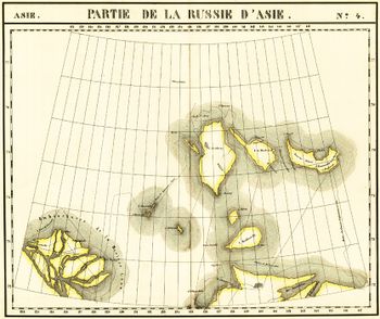 خريطة جزر سيبيريا الجديدة (فيليپ ڤاندرمالن "خريطة روسيا الآسيوية"، ح. 1820). أرض بونگه لم تكن قد اكتـُشـِفت بعد، ولذلك جزيرة فدىيڤسكي و جزيرة كوتلني كانتا تُعتبران منفصلتين.