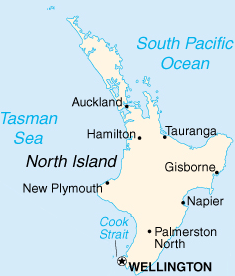 Twelve main urban areas (half of them officially cities) are in the North Island. From north to south, they are Whangarei, أوكلاند، Hamilton, Tauranga, Rotorua, Gisborne, New Plymouth, ناپيير، Hastings, Whanganui, Palmerston North، و ولنگتون، العاصمة، الواقعة على الطرف الجنوبي الغربي للجزيرة. About 76% of New Zealand's population lives in the North Island.
