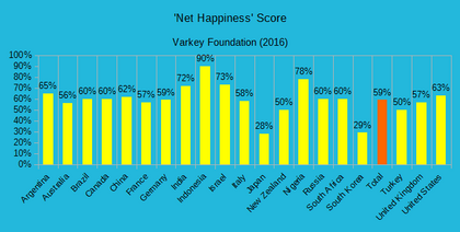 The Economist has described Generation Z as a more educated, well-behaved, stressed and depressed generation in comparison to previous generations.[17] In 2016, the Varkey Foundation and Populus conducted an international study examining the attitudes of over 20,000 people aged 15 to 21 in twenty countries: Argentina, Australia, Brazil, Canada, China, France, Germany, India, Indonesia, Israel, Italy, Japan, New Zealand, Nigeria, Russia, South Africa, South Korea, Turkey, the United Kingdom, and the United States. They found that Gen Z youth were happy overall with the states of affairs in their personal lives (59%). The most unhappy young people were from South Korea (29%) and Japan (28%) while the happiest hailed from Indonesia (90%) and Nigeria (78%). In order to determine the overall 'happiness score' for each country, researchers subtracted the percentage of people who said they were unhappy from that of those who said they were happy. The most important sources of happiness were being physically and mentally healthy (94%), having a good relationship with one's family (92%), and one's friends (91%). In general, respondents who were younger and male tended to be happier. Religious faith came in last at 44%. Nevertheless, religion was a major source of happiness for Gen Z youth from Indonesia (93%), Nigeria (86%), Turkey (71%), China, and Brazil (both 70%). The top reasons for anxiety and stress were money (51%) and school (46%); social media and having access to basic resources (such as food and water) finished the list, both at 10%. Concerns over food and water were most serious in China (19%), India (16%), and Indonesia (16%); young Indians were also more likely than average to report stress due to social media (19%).[104]