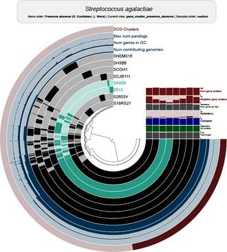 - ^ Page AJ, Cummins CA, Hunt M, Wong VK, Reuter S, Holden MT, et al. (November 2015). "Roary: rapid large-scale prokaryote pan genome analysis". Bioinformatics. 31 (22): 3691–3. doi:10.1093/bioinformatics/btv421. PMC 4817141. PMID 26198102.