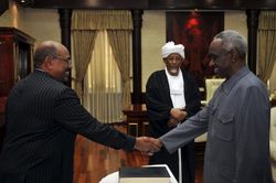 من اليمين: الحاج آدم يوسف، نائب أول رئيس السودان علي عثمان طه، الرئيس عمر البشير، أثناء تولي الحاج آدم منصب نائب رئيس السودان، 14 سبتمبر 2011.