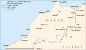 تبدأ الحدود في الشمال على ساحل المتوسط إلى الغرب من مرسى بن مهيدي؛ ثم تستمر براً نحو الجنوب عبر سلسلة من المسارات الغير منتظومة، وتنحرف قليلاً إلى الجنوب الشرقي.[2] بالقرب من بلدة فكيك المغربية تنحرف بحدة نحو الغرب، وتمضي في الاتجاه الجنوبي الغربي عبر سلسلة من المسارات المستقيمة وغير المنتظمة. عند وصولها نهر درعة بعدها تتبع الحدود النهر قبل أن تنحرف بحدة نحو الجنوب، ميث تمتد بخط مستقيمن من الشمال إلى الجنوب لمسافة 116 كم جهة الصحراء الغربية.[2]