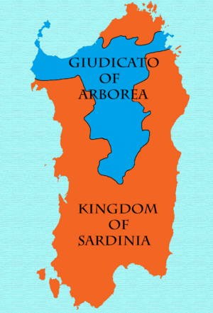 The Arborean judge Hugh II of Arborea became a vassal of James II of Aragon in exchange for the maintenance of the dynastic rights over his Judicate, with the hope to expand his control over the whole of Sardinia, as lieutenant of the king, residing in Barcelona.[2] Hugh opened hostilities against Pisa and actively participated in the subsequent Aragonese military actions against the Pisans who, repeatedly defeated by land and sea (despite the help of the Doria and Genoa), were forced to yield their Sardinian possessions (former Judicate of Cagliari and Judicate of Gallura) to the Iberians. These lands, along with the commune of Sassari, became the first territorial nucleus of the Kingdom of Sardinia.