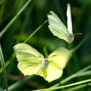 A pair of brimstone butterflies in flight. The female, above, is in fast forward flight with a small angle of attack; the male, below, is twisting his wings sharply upward to gain lift and fly up towards the female.