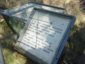 لافتة مقابلة للحفرة، مكتوب عليها "لو أن جميع الماسات المستخرجة من منجم كمبرلي أمكن جمعها معاً، فإنها ستملأ ثلاثة عربات مثل هذه.