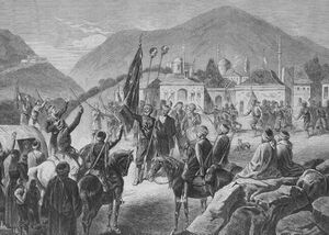 The Ottoman army in Bosnia and Herzegovina at the time consisted of roughly 40,000 troops with 77 cannons, that, when combined with local militias, totalled around 93,000 men.[7] The Austro-Hungarian troops were occasionally met with ferocious opposition from elements of both Muslim and Orthodox populations there, and significant battles occurred near Čitluk, Stolac, Livno and Klobuk.[8] Despite setbacks at Maglaj and Tuzla, Sarajevo was occupied in October 1878. Austro-Hungarian casualties amounted to over 5,000 and the unexpected violence of the campaign led to recriminations between commanders and political leaders.[9] Fierce resistance from Muslims was expected as Austro-Hungarians realized their occupation meant that Bosnian Muslims would lose their privileged status based on their religion.[1]