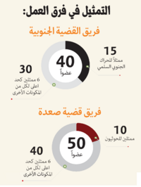 | 1 | القضية الجنوبية | 40 | 15 من الحراك الجنوبي و6 من كل مكون | محمد علي أحمد[23] [ملاحظة 3] |