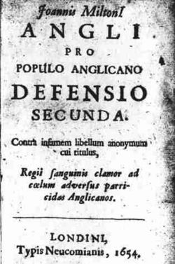 وخشي كرومول أن-تزيد حملات مثل هذا العالم الذائع الصيت في أوربا من الاستياء السائد في القارة ضد حكومته، فطلب إلى ملتون الرد على سالماسيوس. وجهد السكرتير اللاتيني في إنجاز هذه المهمة قرابة عام كامل، في ضوء الشموع، على الرغم من تحذير طبيبه له بأنه يفقد بصره تدريجياً، وأنه مهدد بالعمى. وكانت إحدى العينين عاطلة بالفعل، وفي 31 ديسمبر ظهر "دفاع الشعب الإنجليزي عن نفسه ضد دفاع سالماسيوس عن الملكية-لجون ملتون"، بدأ بالسخرية من سالماسيوس لبيعه خدماته لشارل الثاني، واستطرد ليظهر أن سالماسيوس قبل أربع سنوات فقط كتب يهاجم النظام الأسقفي الذي يدافع عنه الآن: