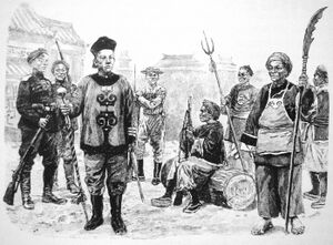During the Boxer Rebellion, 1899–1901, the European powers recruited 10,000 Bannermen from the Metropolitan Banners into Wuwei Corps and gave them modernized training and weapons. One of these was the Hushenying. However, many Manchu Bannermen in Beijing supported the Boxers and shared their anti-foreign sentiment.[51] The pro-Boxer Bannermen sustained heavy casualties and subsequently were driven into desperate poverty.[52]