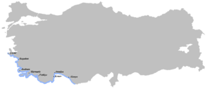 Many cities, towns and villages in the area are internationally known, such as Alanya, Antalya, بودروم, Çeşme, فتحية، Kalkan, كاش, قمر, Kuşadası, مرمريس وسيده.
