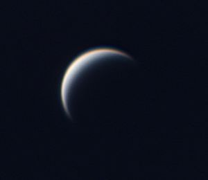 Venus in approximately true colour, a nearly uniform pale cream, although the image has been processed to bring out details.[1] The planet's disc is about three-quarters illuminated. Almost no variation or detail can be seen in the clouds.