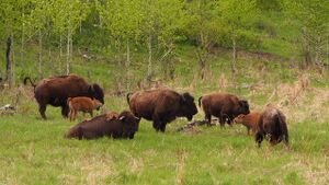 Herd of Plains Bison of various ages resting in Elk Island Park, Alberta