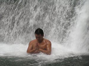 One of the versions of the Shinto purification ceremony of misogi involves standing underneath a waterfall in ritual clothing.[45] In Japan the Nachi Falls are a site of pilgrimage, as are falls near Tirupati, India, and the Saut-d'Eau, Haiti.[43] The Otavalos use Piguchi waterfall as part of the Churru ritual which serves as a coming of age ceremony.[46] Many waterfalls in Africa were places of worship for the native peoples and got their names from gods in the local religion.[21]