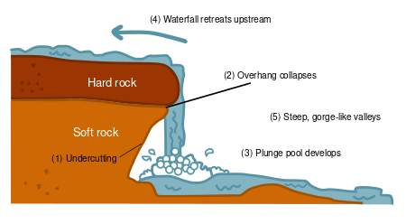 Often, the rock stratum just below the more resistant shelf will be of a softer type, meaning that undercutting due to splashback will occur here to form a shallow cave-like formation known as a rock shelter under and behind the waterfall. Eventually, the outcropping, more resistant cap rock will collapse under pressure to add blocks of rock to the base of the waterfall. These blocks of rock are then broken down into smaller boulders by attrition as they collide with each other, and they also erode the base of the waterfall by abrasion, creating a deep plunge pool in the gorge downstream.[17]