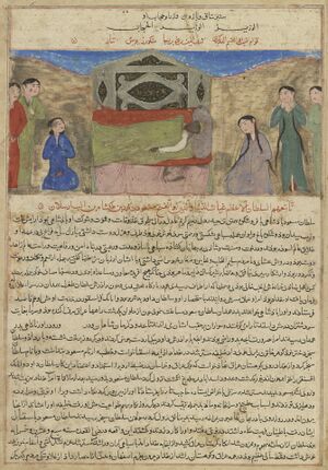 Muhammad Tapar was succeeded by his son Mahmud II (ح. 1118–1131), who ruled over western Persia and (nominally) Iraq, but he faced many claimants. Sanjar, who held Khorasan since 1097, was generally recognized as the head of the Seljuk family.[46] The Nizaris maintained peaceful or friendly relations with Sanjar. According to Juwayni, Sanjar was prompted into these good ties after Hassan-i Sabbah had a eunuch place a dagger beside Sanjar's bed while he was asleep. Several manshurs (decrees) by Sanjar are recorded in the library of Alamut, in which the sultan had conciliated the Nizaris. Sanjar reportedly paid the Nizaris an annual of 3,000–4,000 dinars from taxes of Qumis and allowed them to levy tolls from the caravans passing beneath Girdkuh on the Khurasan Road. The peaceful final years of Hassan-i Sabbah, which were mostly spent consolidating the Nizari position, including the recapture of strongholds in Rudbar that had been lost in Shirgir's campaign, as well as intensifying the da'wa in Iraq, Adharbayjan, Gilan, Tabaristan, and Khurasan, is partly attributed to the Nizari ties with Sanjar.[47] Some Nizaris joined Sanjar's forces in his invasion of Mahmud II's territories in 1129. Mahmud II was defeated in Sawa and most of northern Persia, including Tabaristan and Qumis, which was penetrated by the Nizaris, came under Sanjar's rule. Mahmud II's brother, Tughril, later rebelled and took Gilan, Qazvin, and other districts.[46]