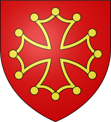 - ^ After the coat of arms of the counts of Toulouse. "The first known Cross of Toulouse is shown on Count Raimond VI's seal, dated from 1211. Then widely used all over Languedoc, the Cross of Toulouse appeared on the municipal arms of Toulouse and the provincial arms of Languedoc in the 14th century. Pierre Saliès (Archistra, December 1994) claims that the Cross of Toulouse is a modification of the Latin Cross, attributed to Count Raimond VI. In 1099, Raimond VI took part to the reconquest of Jerusalem with the Crusaders. As a Crusaders' chief, Raimond would have adapted a cross slightly different from the Latin Cross bore by the low-rank Crusaders. According to this theory, the edges of the arms of the cross were cut into two pieces and curved. To be fixed on a shield, such a cross required twelve rivets. The design would have progressively evolved towards the Cross of Toulouse." (Ivan Sache, 24 April 2003, crwflags.com)