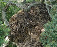 نظرة جزئية للعش. قطعة بلاستيكية زاهية الألوان تظهر في المنتصف.