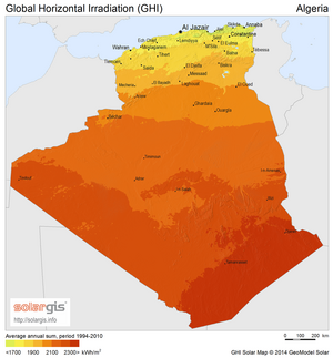 تتمتع الجزائر بأعلى الإمكانات التقنية والاقتصادية لاستغلال الطاقة الشمسية في منطقة الشرق الأوسط وشمال أفريقيا، مع إمكانية تبلغ حوالي 170 ت.و./س سنوياً.[40]