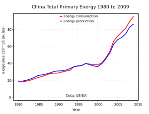 كان ضمان إمدادات الطاقة الكافية للحفاظ على النمو الاقتصادي من الشواغل الأساسية للحكومة الصينية منذ عام 1949. [1] كان الاستخدام الأولي للطاقة في الصين 26.250 تيراواط/ساعة و20 تيراواط/ساعة لكل مليون شخص في عام 2009.[2] وفقاً للوكالة الدولية للطاقة، فقد ارتفع استخدام الطاقة الأولية بنسبة 40% واستخدام الكهرباء بنسبة 70% من 2004 حتى 2009.[2]