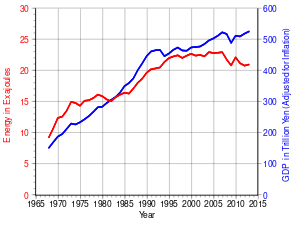 الطاقة في اليابان refers to energy and electricity production, consumption, import and export in Japan. The country's primary energy consumption was 477.6 Mtoe in 2011, a decrease of 5% over the previous year.[1]