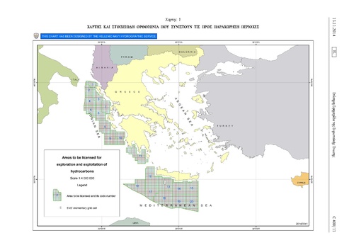 - ^ وزارة البيئة والطاقة اليونانية (2014-11-01). "بلاغ من حكومة الجمهورية الهيلينية وفقًا للتوجيه 94/22 / EC البرلمان الأوروبي والمجلس الأوروبي لشروط منح التراخيص واستخدامها - البحث والبحث وإنتاج الهيدروكربونات". وزارة البيئة والطاقة اليونانية.