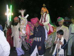 Bridegroom arrives on horseback at a Rajput wedding