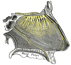 Lesions to the olfactory nerve can occur because of blunt trauma, such a coup-contra-coup damage, meningitis and tumors of the frontal lobe. They often lead to a reduced ability to taste and smell. However, lesions of the olfactory nerve do not lead to a reduced ability to sense pain from the nasal epithelium. This is because pain from the nasal epithelium is not carried to the central nervous system by the olfactory nerve; rather, it is carried to the central nervous system by the trigeminal nerve (cranial nerve V).