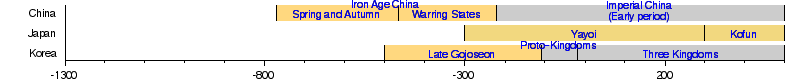 In Japan, iron items, such as tools, weapons, and decorative objects, are postulated to have entered Japan during the late Yayoi period (ح. 300 BC–AD 300)[2] or the succeeding Kofun period (ح. AD 250–538), most likely through contacts with the Korean Peninsula and China.