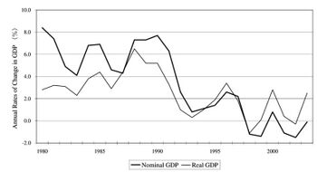 Broadly impacting the entire Japanese economy, over the period of 1995 to 2007, GDP fell from $5.33 trillion to $4.36 trillion in nominal terms,[7] real wages fell around 5%,[8] while the country experienced a stagnant price level.[9] While there is some debate on the extent and measurement of Japan's setbacks,[10][11] the economic effect of the Lost Decades is well established, and Japanese policymakers continue to grapple with its consequences.